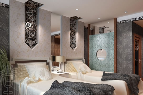 配以中央大型豪華吊燈,營造出豪華堂皇的氛圍。再配以發(fā)光燈槽,既能體現(xiàn)賓館檔次,也能滿足賓館的功能需求。大堂墻面的處理往往會用大量石材為主要材料,增加大堂的光感,使到大堂光亮也非常潔凈。服務(wù)臺是大堂功能的中心,背景墻面可用抽象的造型圖案裝飾,也可用粗框的石材雕塑做裝飾。